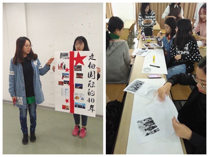 第二個環節是時間軸的制作。同學們分成三組,分別收集改革開放40周年以來中國在“衣食住行”、國際地位和文化發展三個方面的資料和照片,結合專業所學習到的平面構成知識,運用各種材料進行時間軸的制作與設計。