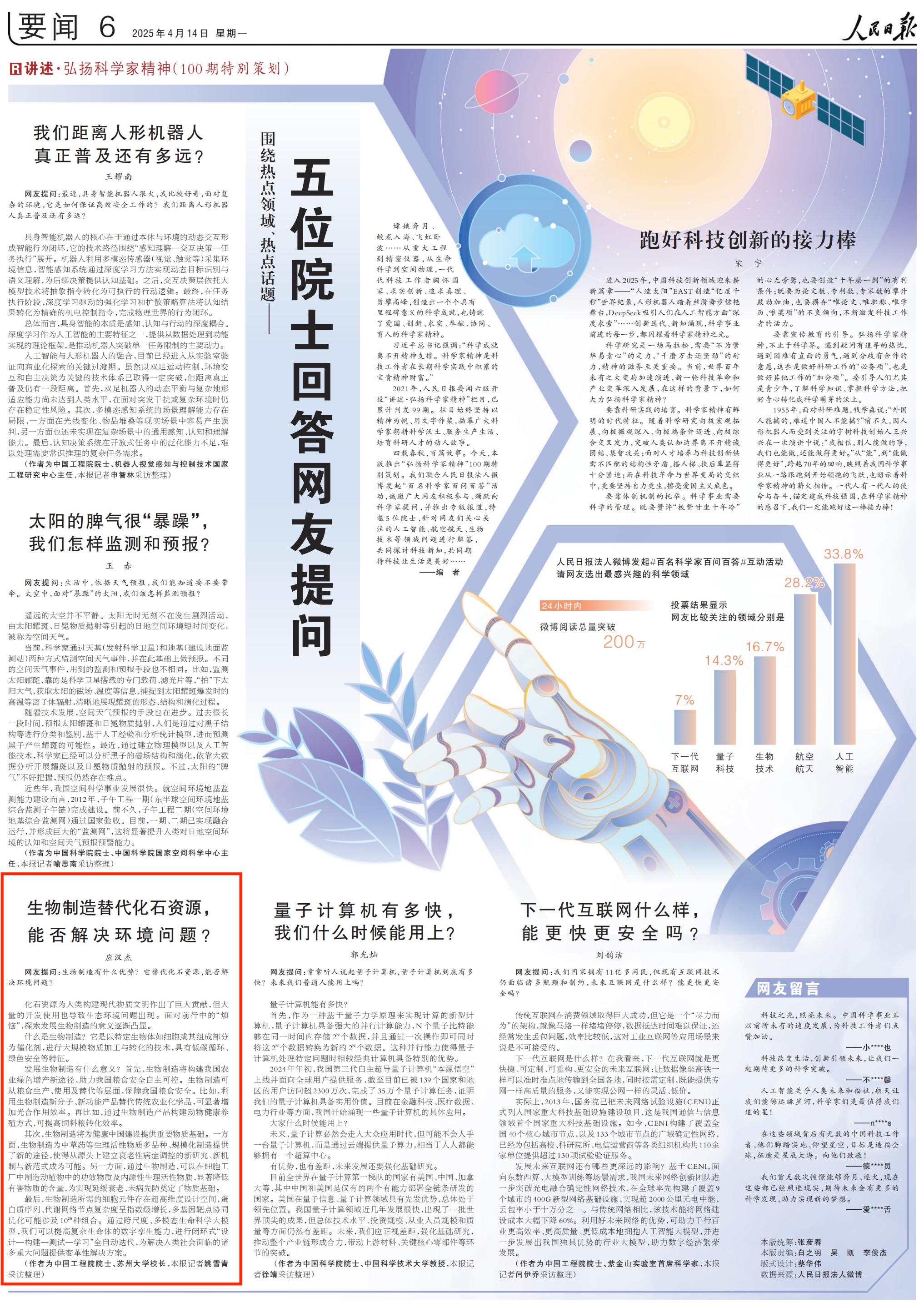 四載春秋,百篇故事。今天,本版推出“弘揚(yáng)科學(xué)家精神”100期特別策劃。我們聯(lián)合人民日報(bào)法人微博發(fā)起“百名科學(xué)家百問百答”活動(dòng),誠邀廣大網(wǎng)友積極參與、踴躍向科學(xué)家提問,并推出專版報(bào)道,特邀5位院士,針對網(wǎng)友們關(guān)心關(guān)注的人工智能、航空航天、生物技術(shù)等領(lǐng)域問題進(jìn)行解答,共同探討科技新知,共同期待科技讓生活更美好……