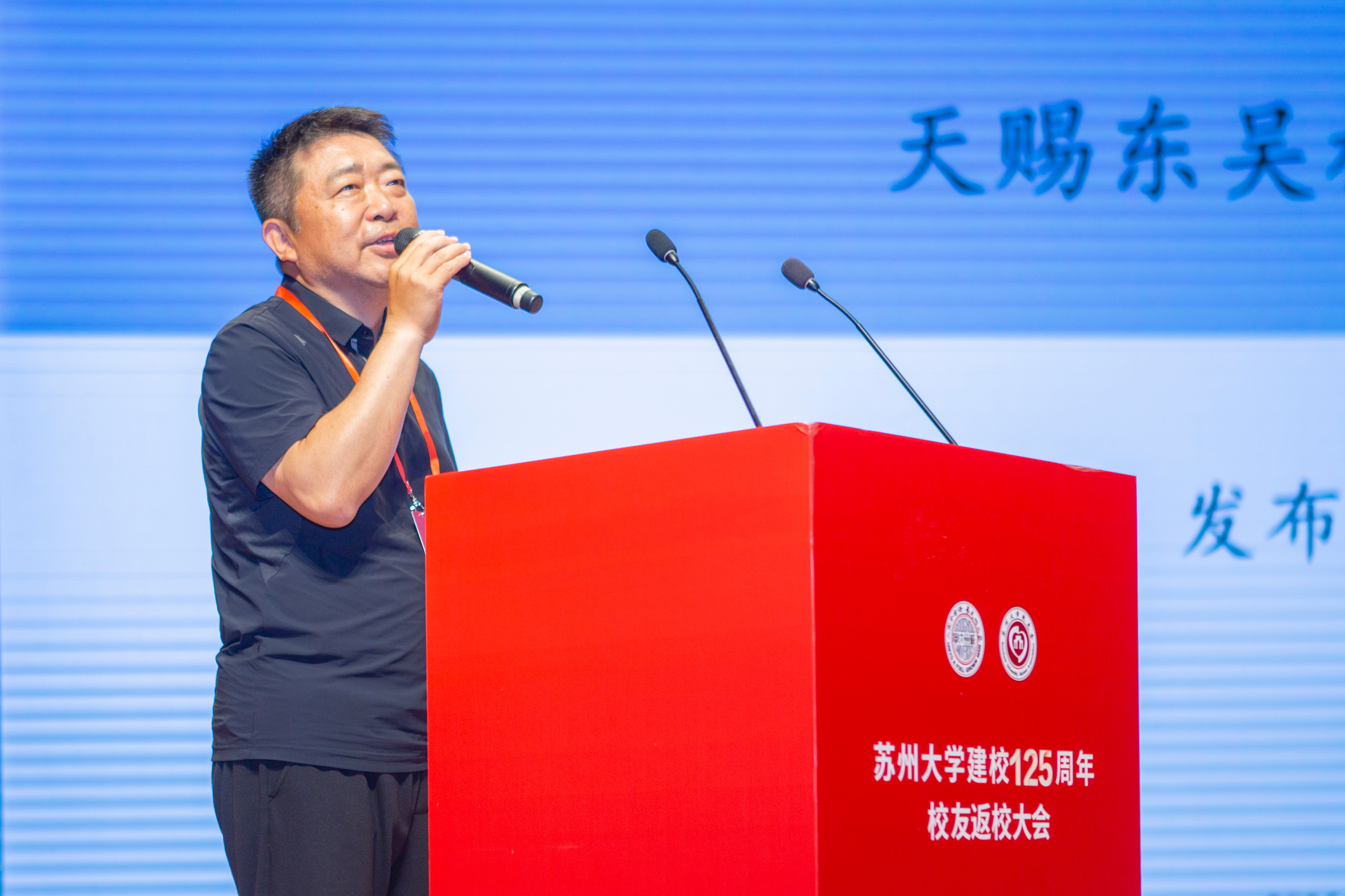 校友代表、1977級校友、物理校友會會長、江蘇捷美投資發展集團有限公司執行董事兼總經理王振明博士回顧了在母校學習和工作的故事,分享了創業過程中母校給予的資源和幫助。他表示,蘇州大學是廣大學子最堅實的后盾,學校的發展更是全體校友共同的榮光,希望校友們能常懷感恩之心,將蘇大人的精神薪火相傳,助力母校在新的百年征程上再創輝煌。