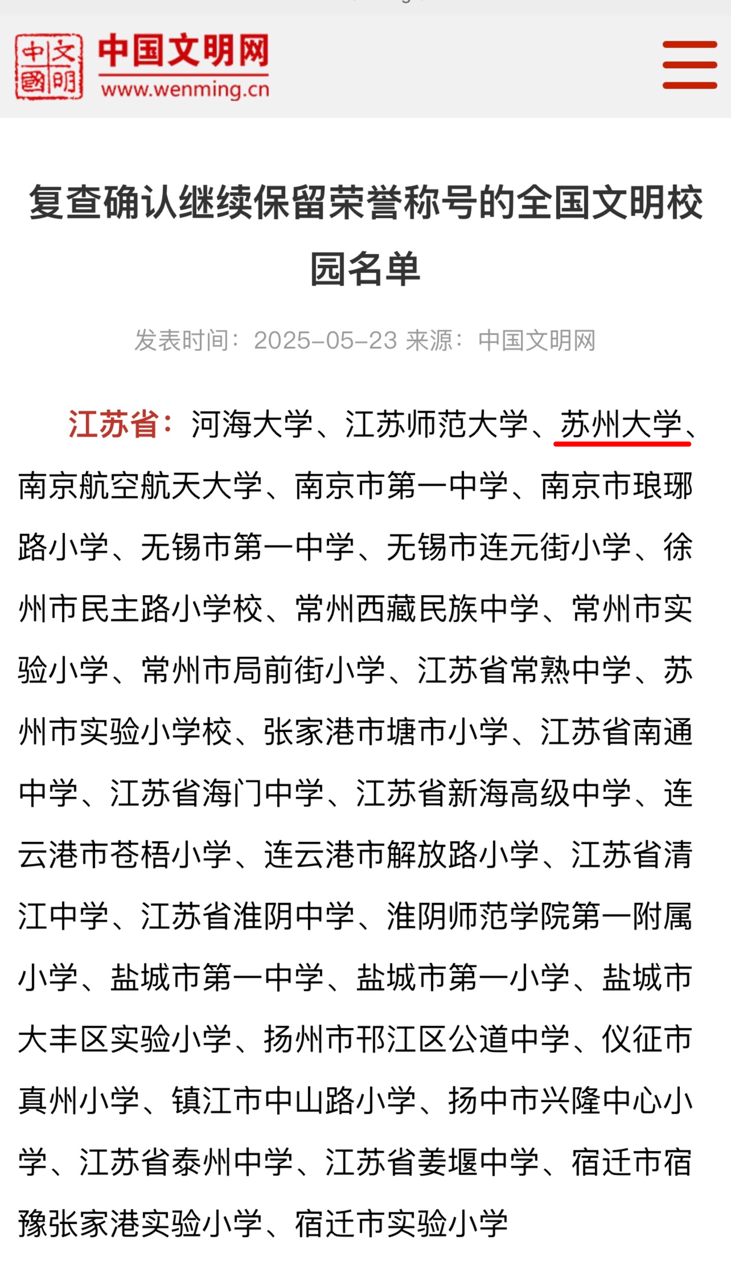 日前,全國精神文明建設表彰大會在京召開。會上公布了第七屆全國文明城市、文明村鎮、文明單位,第三屆全國文明家庭、文明校園。經復查評估,蘇州大學確認繼續保留“全國文明校園”榮譽稱號。