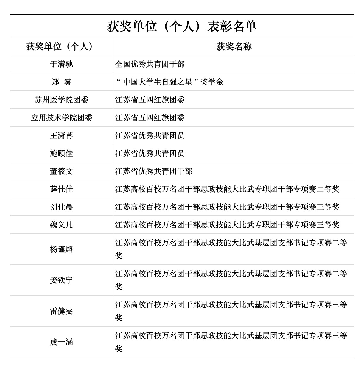 于潛馳獲評全國優秀共青團干部。鄭霧獲“中國大學生自強之星”獎學金。蘇州醫學院團委、應用技術學院團委獲評江蘇省五四紅旗團委,王瀟苒、施顧佳獲評江蘇省優秀共青團員,董筱文獲評江蘇省優秀共青團干部。在江蘇高校百校萬名團干部思政技能大比武專職團干部專項賽中,薛佳佳獲二等獎,劉仕晨、魏義凡獲三等獎。在基層團支部書記專項賽中,楊謹熔、姜鐵寧獲二等獎,雷健雯、成一涵獲三等獎。